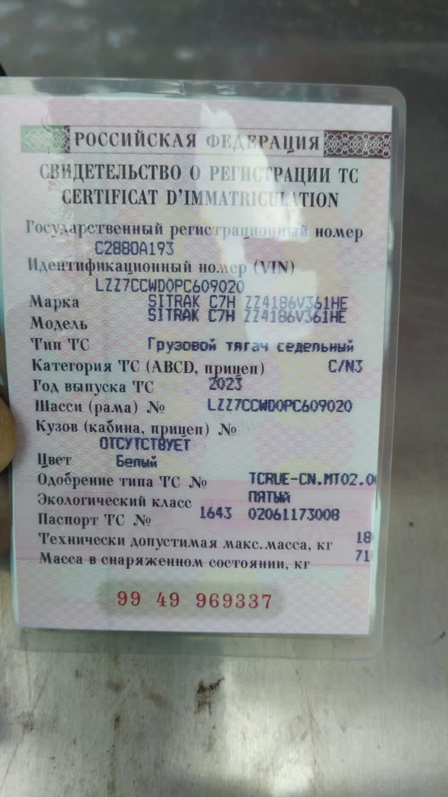 Транспортное средство SITRAK, коммерческое наименование C7H, 2023 года выпуска, идентификационный номер LZZ7CCWD0PC609020