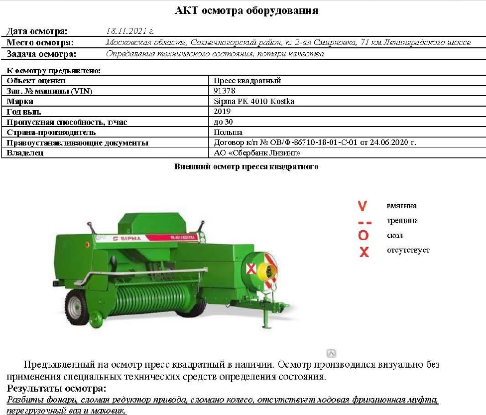 Пресс квадратный SIPMA PK 4010 KOSTKA, 2019 г.в., Зав. Номер: 91378, принадлежащего АО "Сбербанк Лизинг" на праве собственности, что подтверждается Договором купли-продажи № ОВ/Ф-86710-18-01-С-01 от 24.06.20 г.