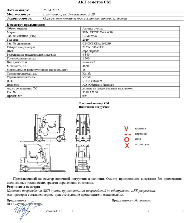 АВТОПОГРУЗЧИК, TFN, CPCD15N-RW10, 2019 г.в., VIN: F3AI03926, принадлежащего Доверителю на праве собственности, что подтверждается Договором купли-продажи № ОВ/Ф-74074-07-01 от 06.03.2020 г.