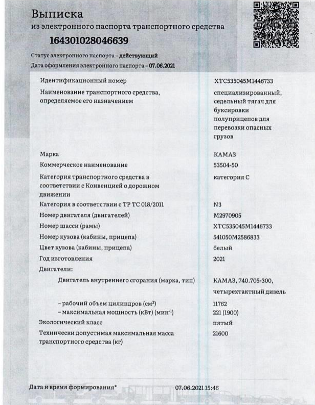 СПЕЦИАЛИЗИРОВАННЫЙ, СЕДЕЛЬНЫЙ ТЯГАЧ ДЛЯ БУКСИРОВКИ П, 2021 г.в., VIN: XTC535045M1446733, принадлежащего Доверителю на праве собственности, что подтверждается Договором купли-продажи № ОВ/Ф-132483-06-01-С-01 от 24.06.21 г.