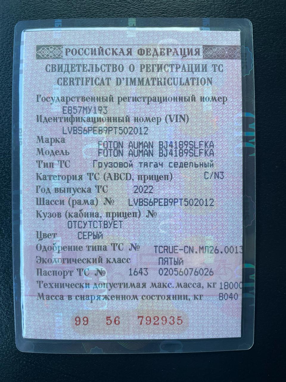 Грузовой тягач FOTON AUMAN, год изготовления 2022, VIN LVBS6PEB9PT502012 |